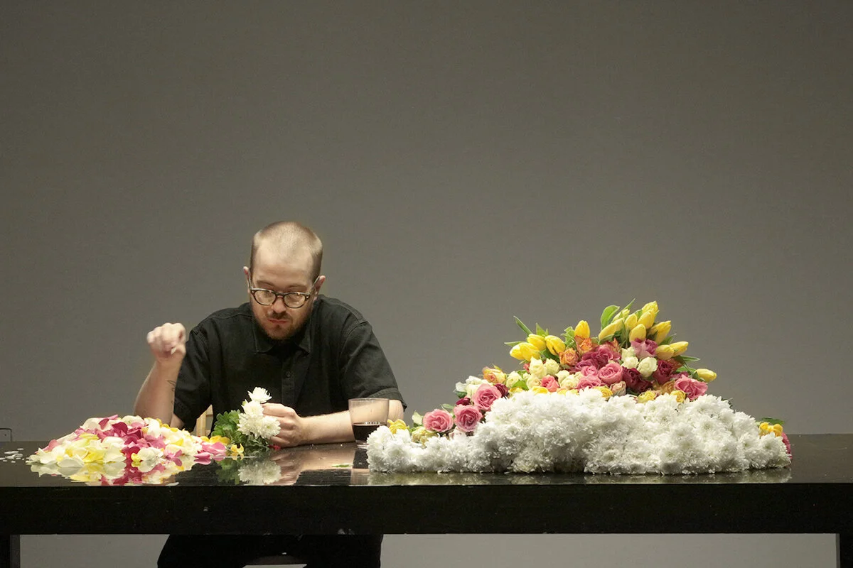He Loves Me is a four-and-a-half-hour durational performance that was developed in the workshop “Dissenting Bodies Marking Time” with Marilyn Arsem and performed as part of Venice International Performance Art Week in 2020. The main action of this performance is sitting at a table and picking petals, one by one, off of chrysanthemums, tulips, and roses for almost five hours. As audience members enter the space, I pause briefly to acknowledge them with eye contact.